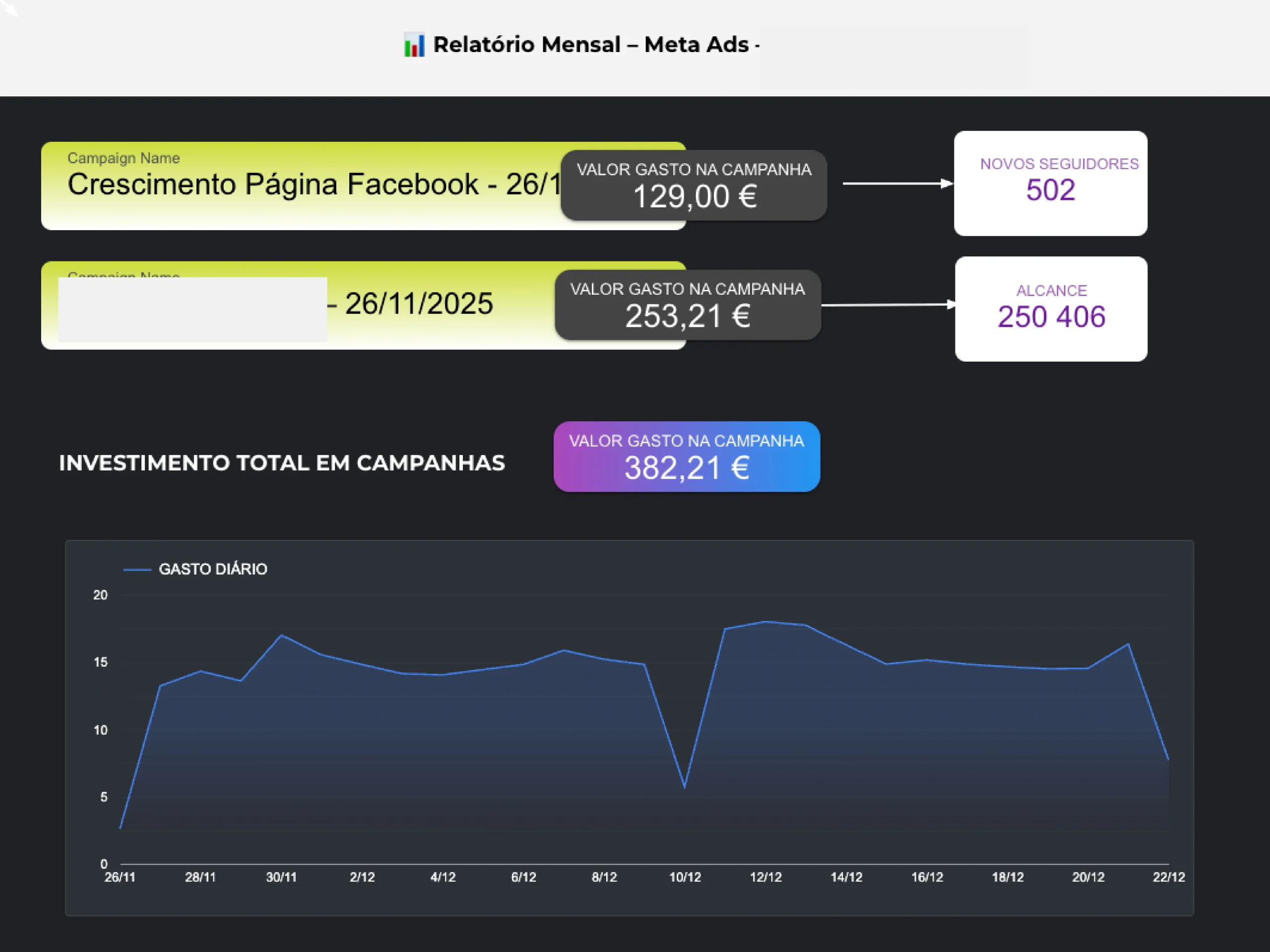 Campanhas Meta e Google Ads com análise e otimização contínua.